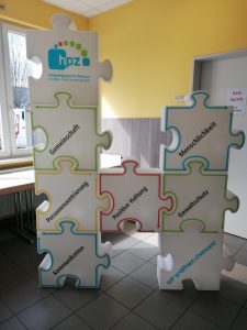 Jeder einzelne Begriff steht auf einem Puzzleteil. Alle Puzzleteile sind miteinander verbunden. Das Leitbild als Plexiglasscheibe ist jetzt an jedem Standort zu finden. Zusätzlich kann es auf iPads in Form einer Audiodatei abgespielt werden.